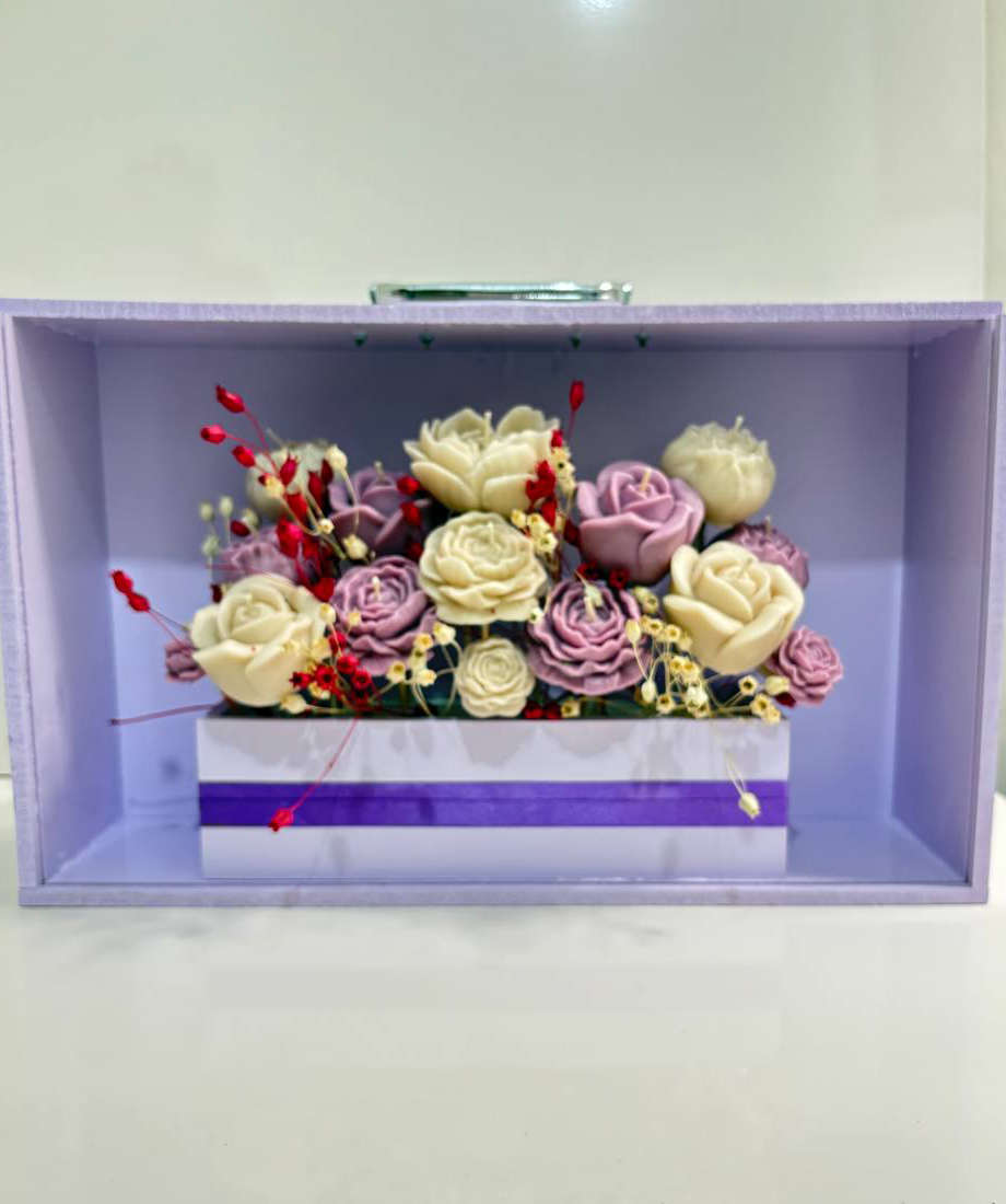 در نگاه اول، گل های رز درون این باکس آن قدر طبیعی و واقعی به نظر می رسند که تشخیص شمع بودن آن ها دشوار است. بافت ظریف گلبرگ ها، رنگ بندی ملایم و درخشش لطیف سطح شمع ها، همه دست ساز و با دقتی هنرمندانه ساخته شده اند. این باکس معمولاً شامل چند شمع رز در رنگ های مختلف مانند بنفش، کرم، سفید یا طلایی است که هرکدام نمادی از احساسی متفاوت اند.