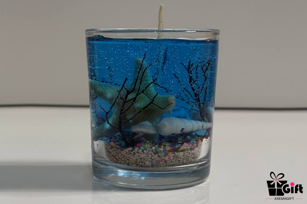 نور زردِ گرم شمع وقتی روی لایه های آبی رنگ ژل می افتد، حس آرامش ساحل را زنده می کند؛ همان لحظه هایی که آدم روی شن ها قدم می زند و موج ها به آرامی عقب و جلو می شوند.